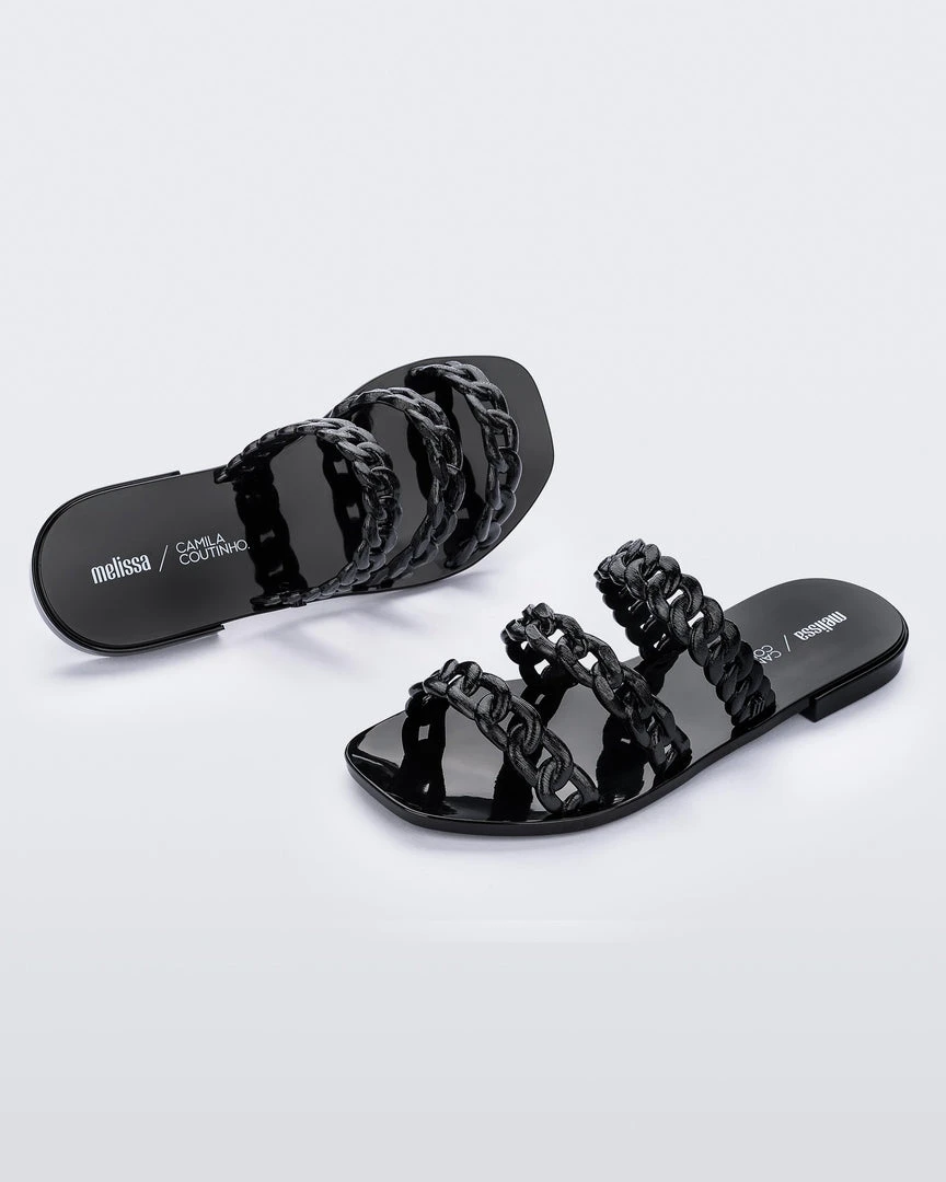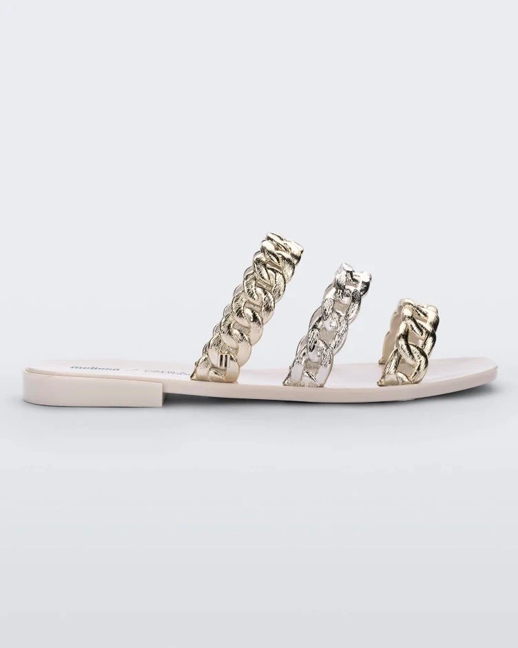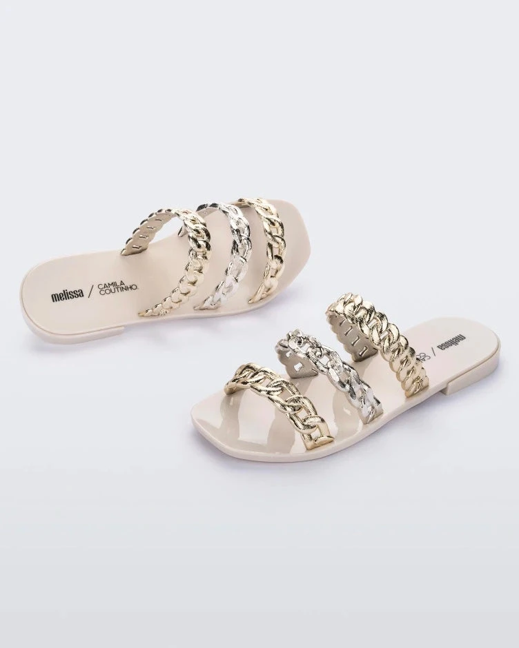 Melissa has collaborated with Brazilian influencer Camila Coutinho to create a flat slide that is edgy, shiny, and Instagram-worthy. The Melissa Feel has a thin sole with a small heel and three straps that form its upper, all made in a shape that resembles chains. Team it with one of this season’s jumbo chain bags and you will be ready for a selfie!